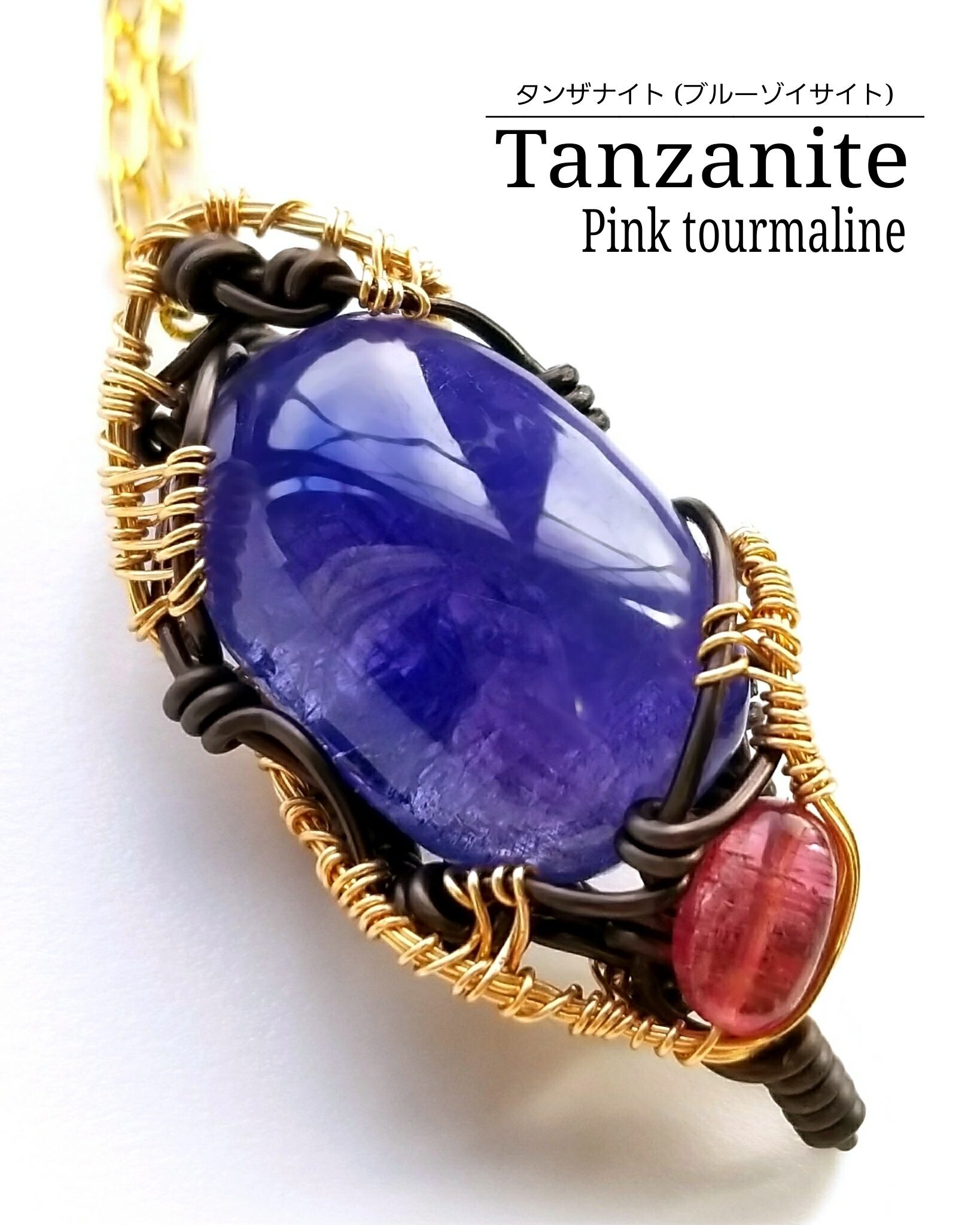大きなサイズのタンザナイトとピンクトルマリンのチャームを組み合わせ、ゴールドのアーティスティックワイヤーとブラックのアルマイト鍍金アルミワイヤーを使用し、ペンダントトップにデザインしました。