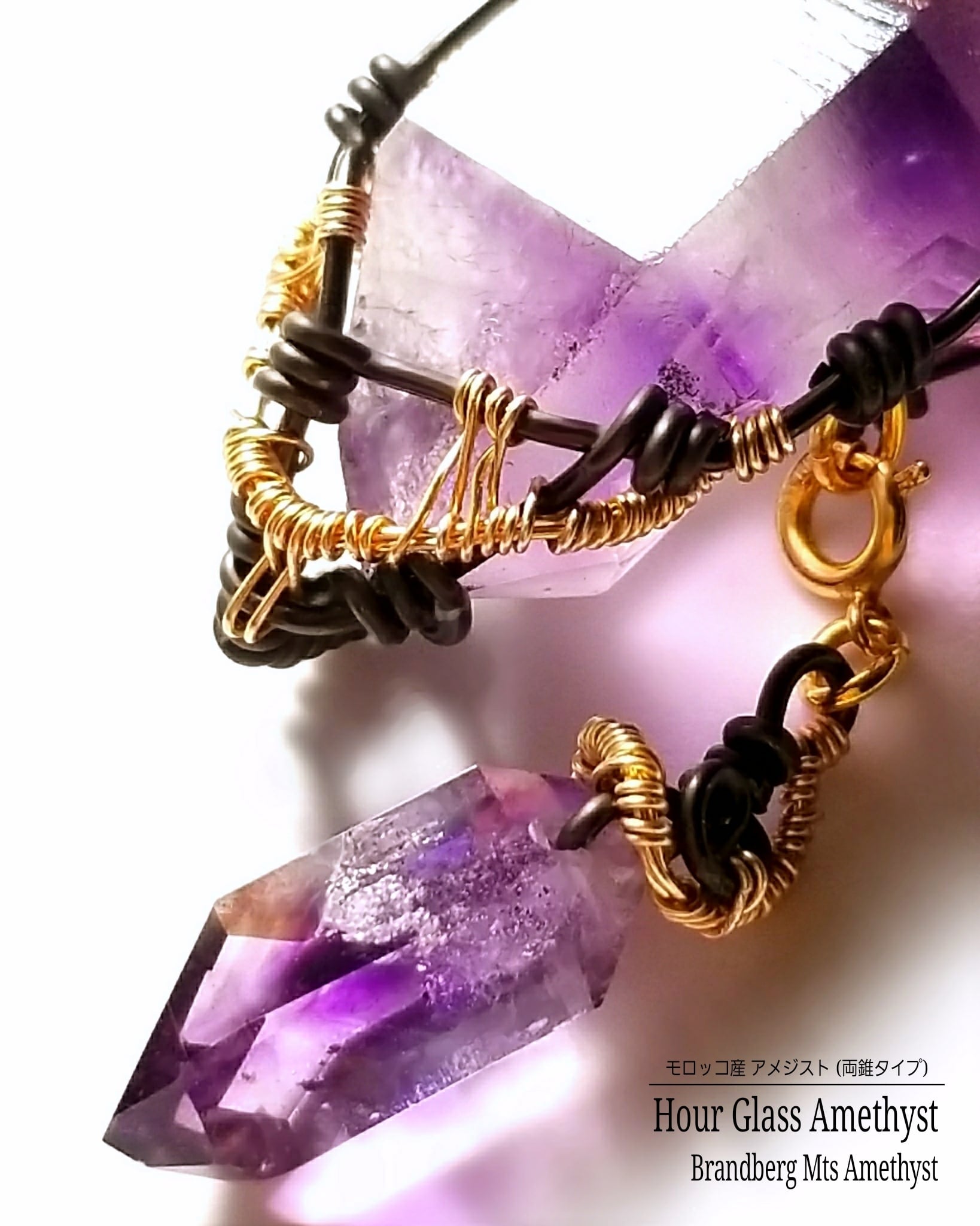 両錐タイプのモロッコ産アメジストとブランドバーグ・マウンテン産のアメジストを組み合わせ、ゴールドのアーティスティックワイヤーとアルマイト鍍金アルミニウム製ワイヤーを使用し、ペンダントトップにデザインしました。