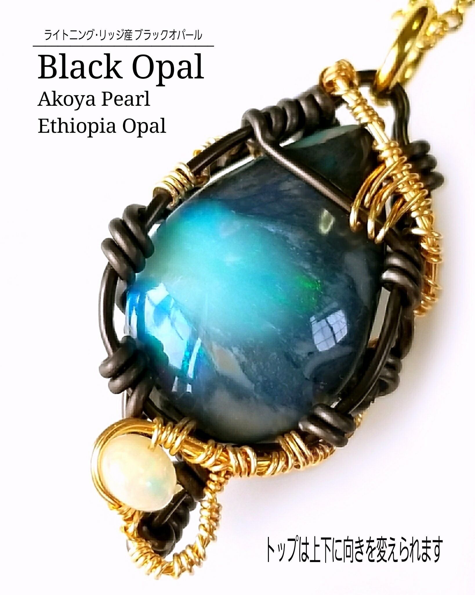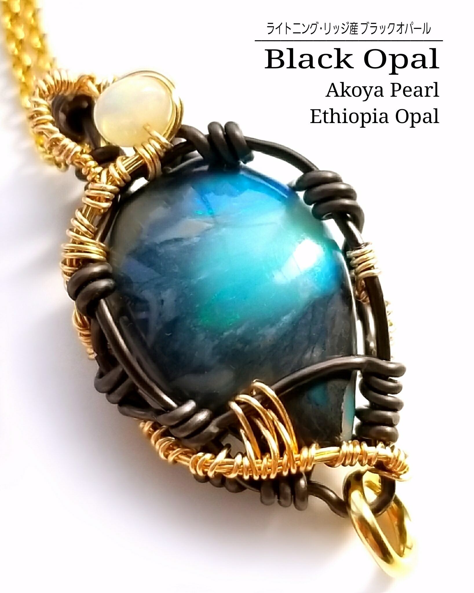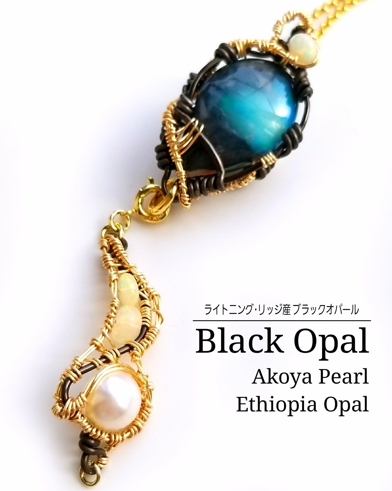 オーストラリアはライトニングリッジ産のブラックオパールに、伊勢志摩産アコヤ真珠とエチオピアンオパールのチャームを組み合わせ、ゴールドのアーティスティックワイヤーとブラックのアルマイト鍍金アルミ製ワイヤーを使用し、ペンダントにデザインしました。